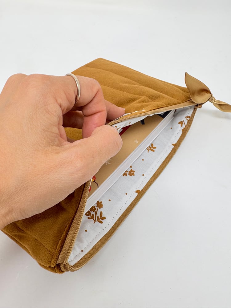 - Une pochette à livre en velours matelassé moutarde de très belle qualité et tout doux