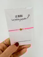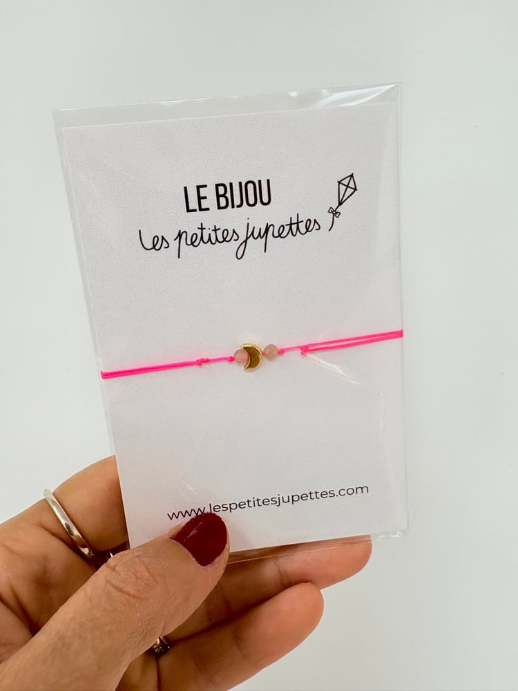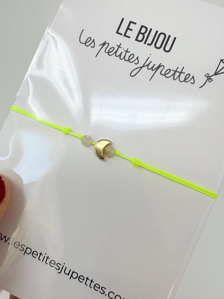 Un joli bracelet monté par mes soins avec un lien fluo, une jolie lune en plaqué or 3 microns ainsi que 2 petites perles à facettes en pierre de lune. De jolis matières pour un bijou unique et fin !