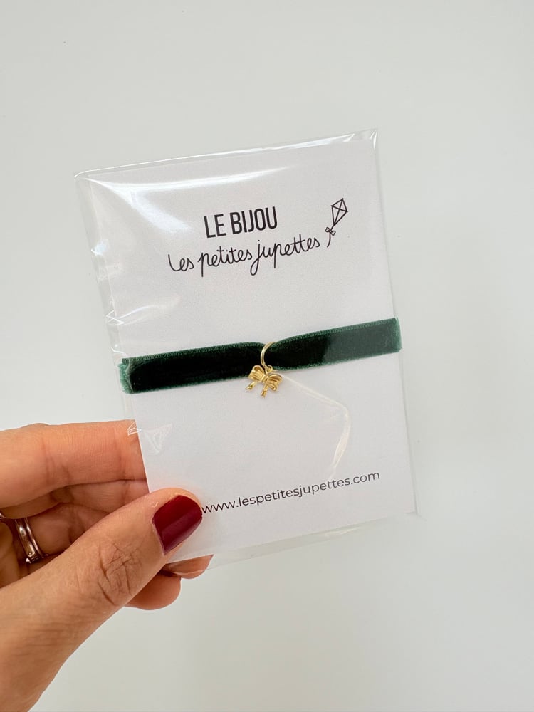 Bracelet ENFANT ruban velours élastique et breloque noeud or laminé