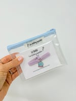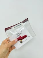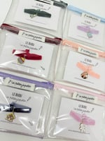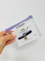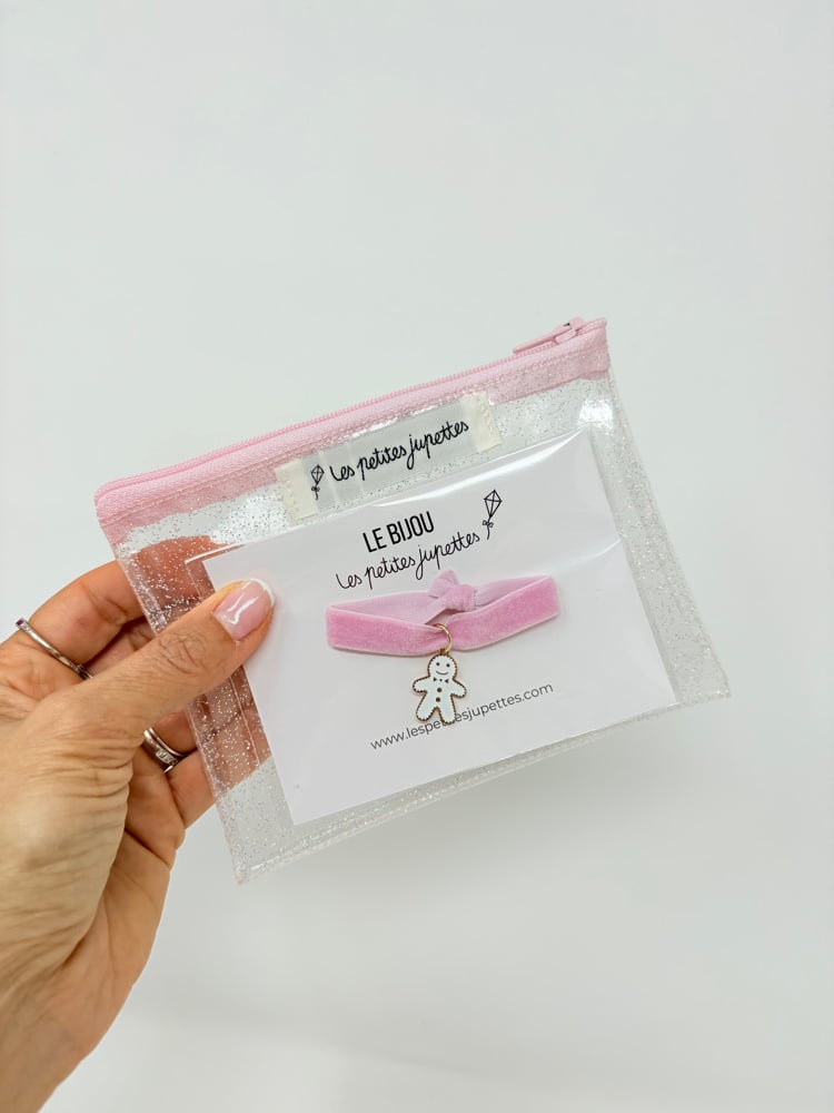 Un joli ensemble composé d'une pochette transparente pailletée petit format ainsi qu'un bracelet avec un ruban velours élastique. Modèle enfant.