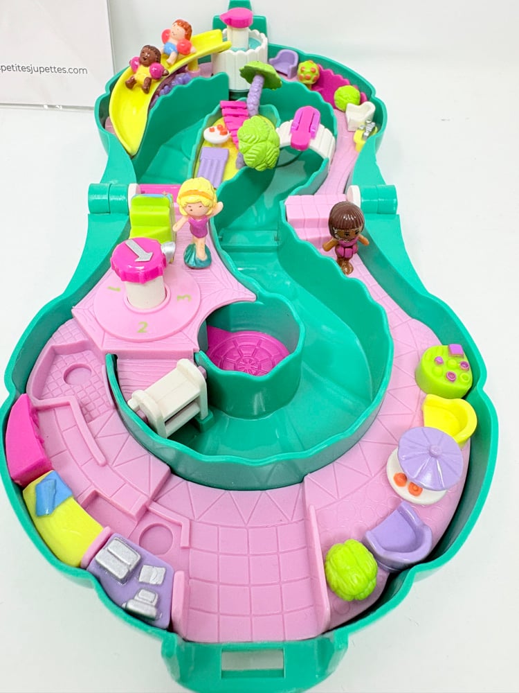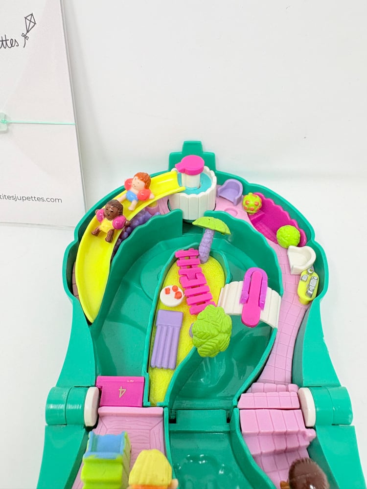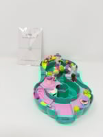 Il s'agit ici du Polly Pocket boite vague verte Complet. En très bon état. Vendu avec ses 4 personnages d'origine. 2 bébés et 2 femmes. En très bon état.