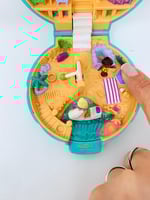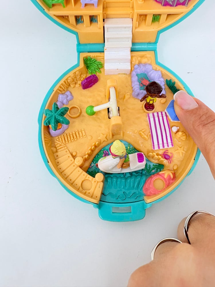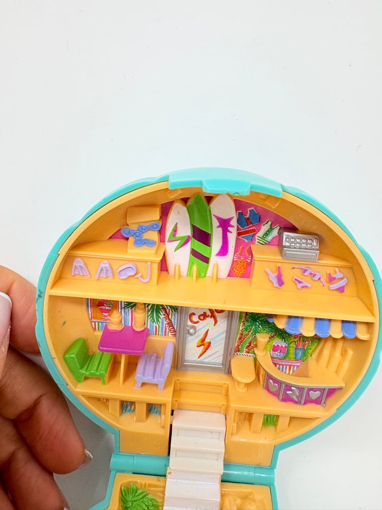 Il s'agit ici du Polly Pocket Coquillage turquoise du café de la plage Complet. Il est vendu avec ses 2 personnages et le jet ski d'origine. En appuyant sur le parasol on fait aller le ballon de Volley d'un côté et de l'autre.