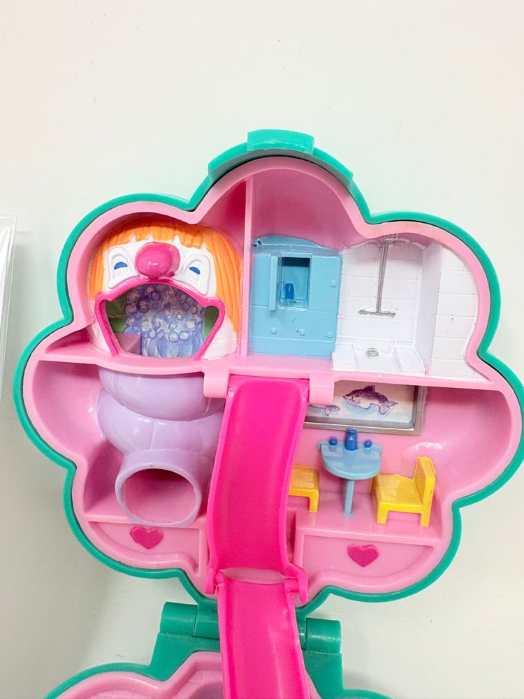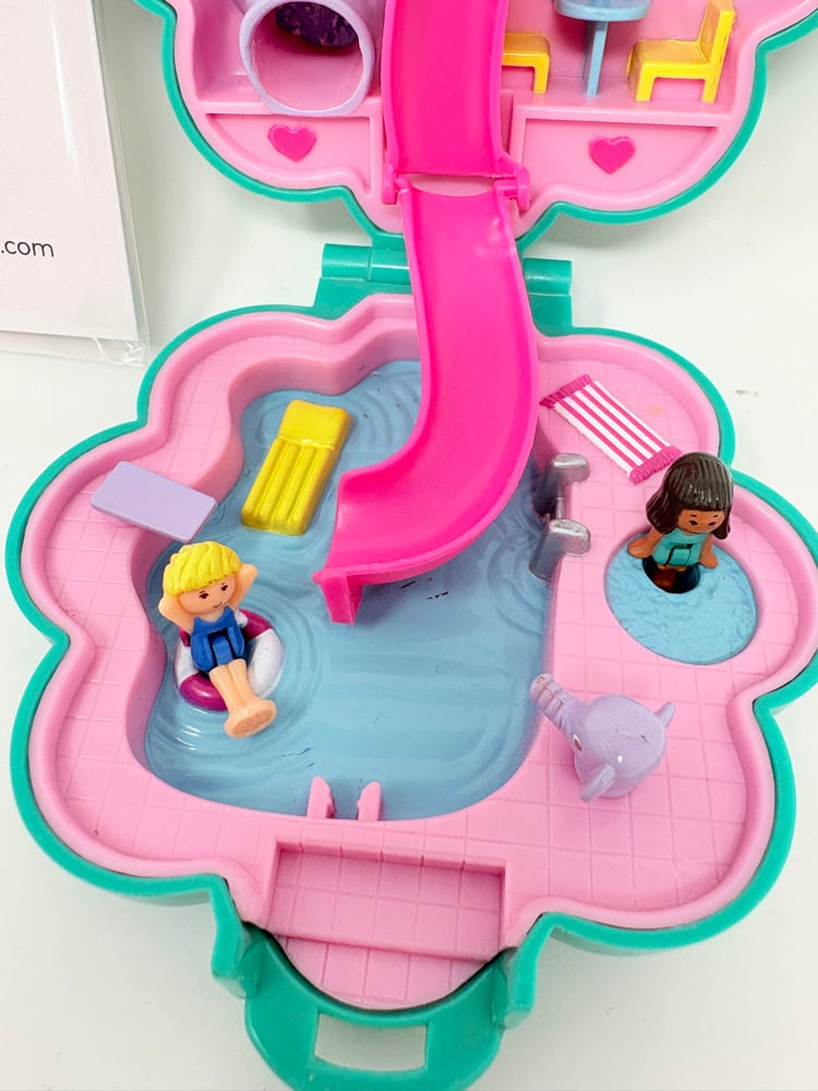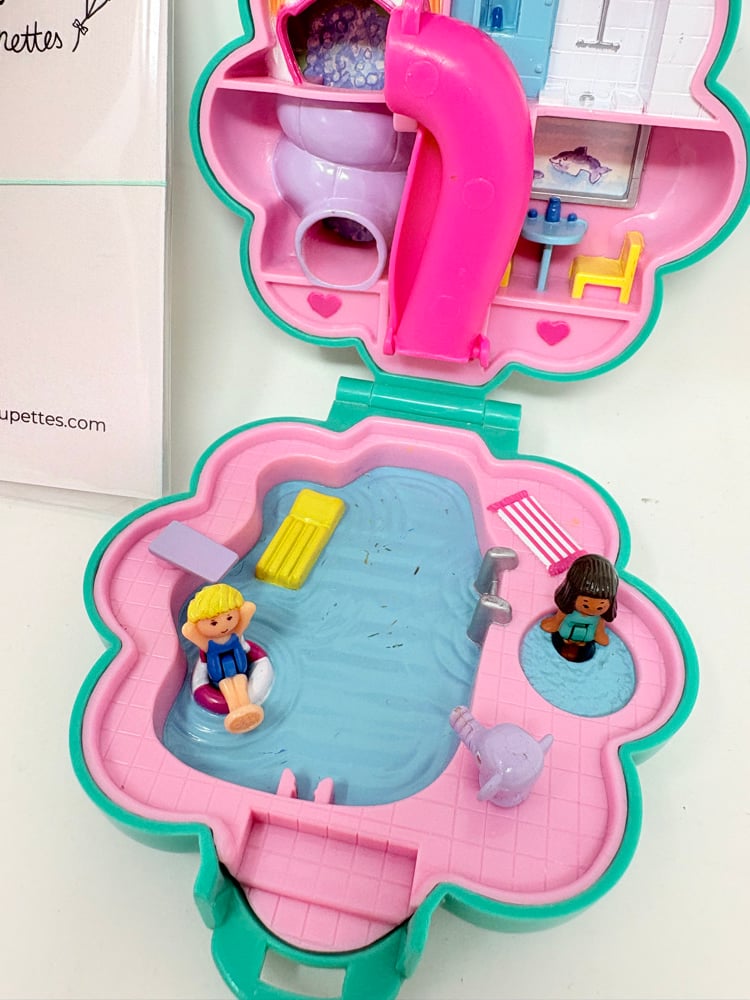 Il s'agit ici du Polly Pocket fleur vert foncé Le Parc Aquatique COMPLET et en très bel état. Avec ses 2 personnages d'origine en parfait été. Le Toboggan est entier avec ses 2 parties. Pas de casse, pas de choses abimées, à part le logo un peu effacé sur le dessus de la boîte. Boîte plutôt rare surtout dans ces conditions !