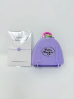 Il s'agit ici du Polly Pocket valise violette de ski. Vendu avec le personnage, les skis, le surf, la luge, la piste de ski et la table d'origine. Quasi complète il ne manque que la mini valise. Tout est en très bon état. On peut faire avancer le personnage sur ses skis avec le petit curseur sur le côté de la valise.