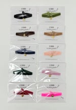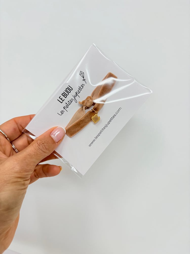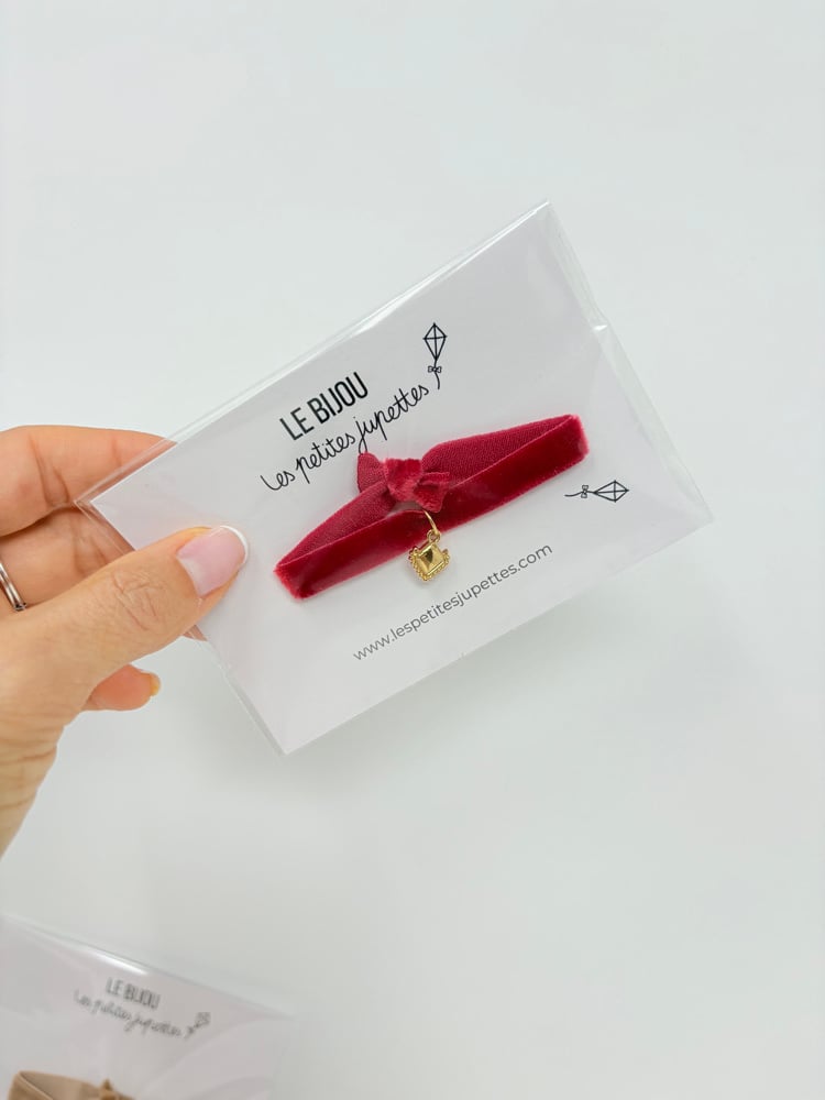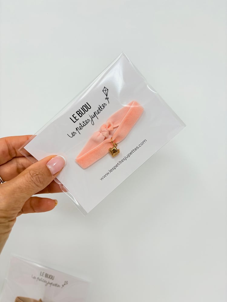 Il s'agit d'un ruban élastique en velours qui permet de le mettre et de l'enlever très facilement avec une jolie breloque losange dorée dorée à l'or fin (origine Europe).