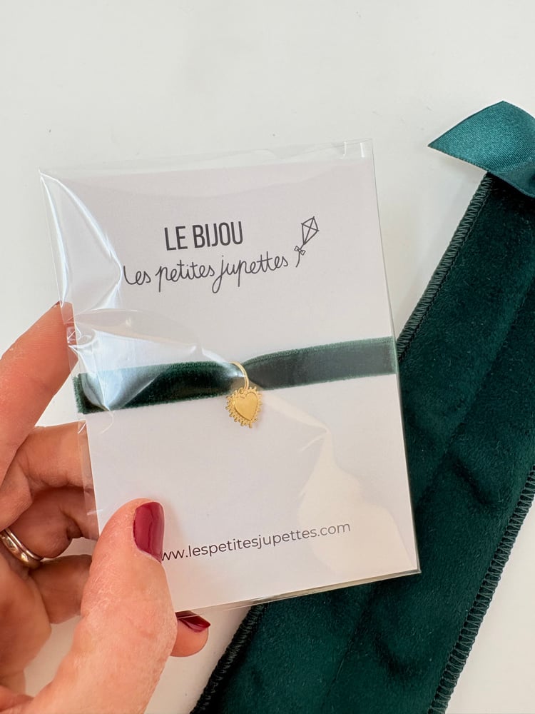 Le joli cadeau : Bracelet ruban velours et marque-page matelassé vert